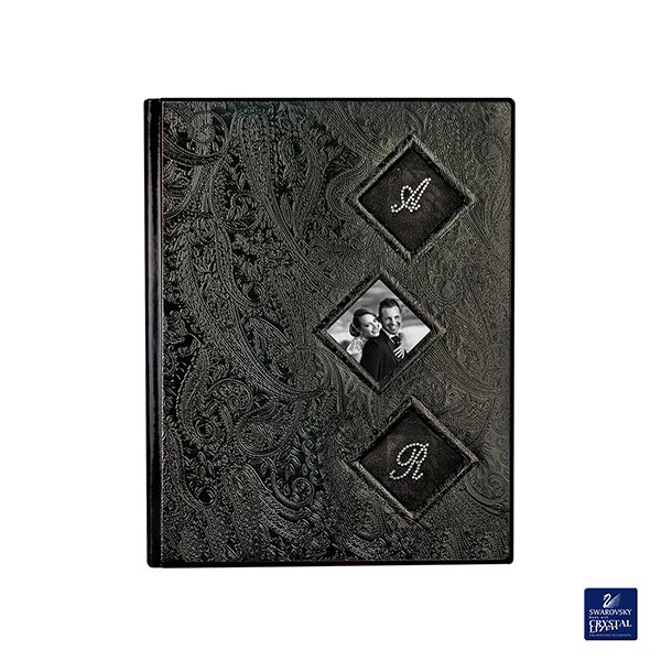 Album in combinazione di due texture: vernice nero e tessuto 445 con fantasia in rilievo. La copertina è impreziosita da tre inserti ad incastro personalizzati con photo e iniziali con applicazione Swarovsky su vellluto nero.