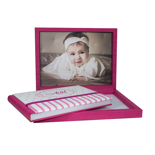 Case in larice fucsia dotato di nastro per facilitare la presa dell’album. Copertura superiore ed interna inferiore personalizzabile nome in stampa uv in rilievo. Copertura interna superiore personalizzabile con photo.
