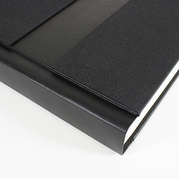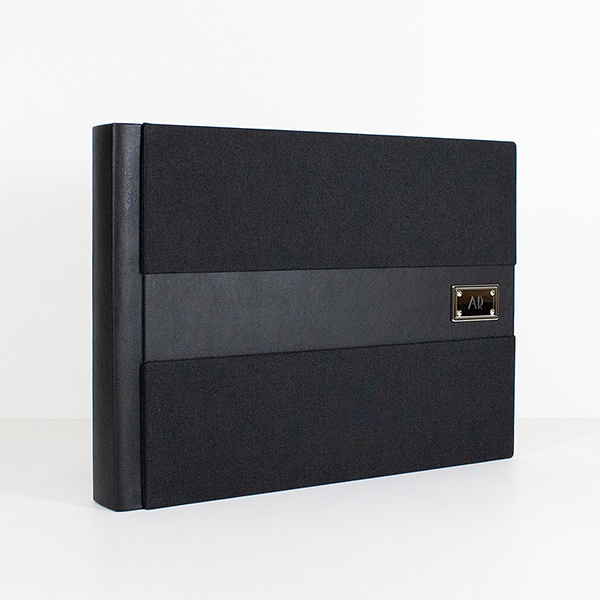 Album in e-leather nero e cotone nero. La copertina imbottita in cotone presenta una fascia ad incastro in e-leather con placca in metallo argento personalizzata con iniziali in stampa UV in rilievo.