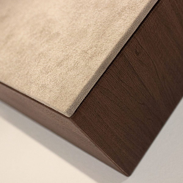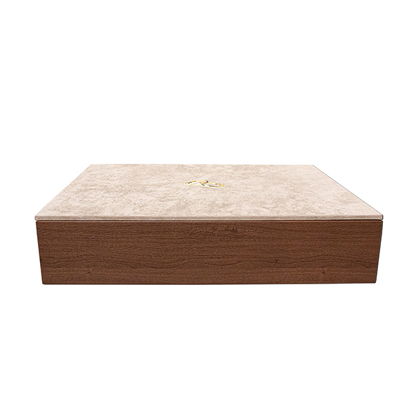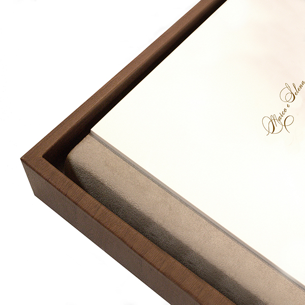 Case in larice marrone con coperchio ad incastro in camoscio avorio personalizzabile con stampa UV in rilievo. Interno superiore personalizzabile con photo. Il case è dotato di nastro in raso per facilitare la presa dell’album.