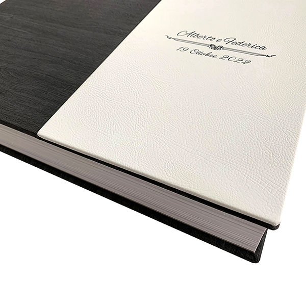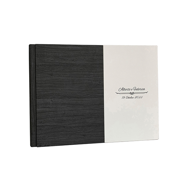 Album in larice nero e semicopertina in e-leather personalizzabile con nomi in stampa uv in rilievo.