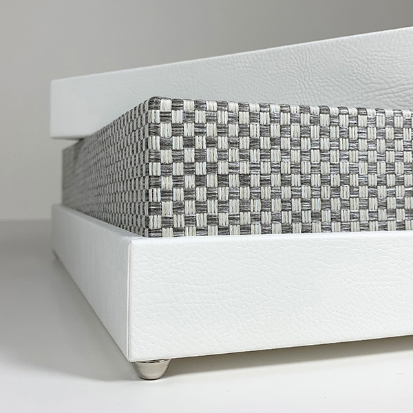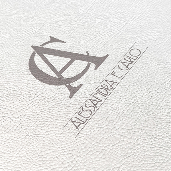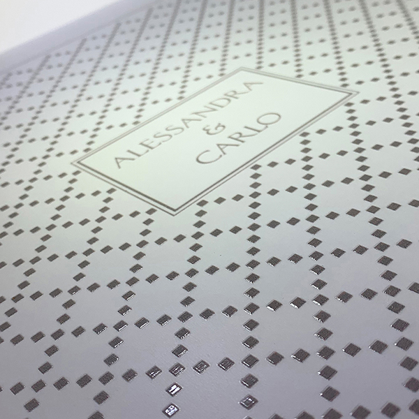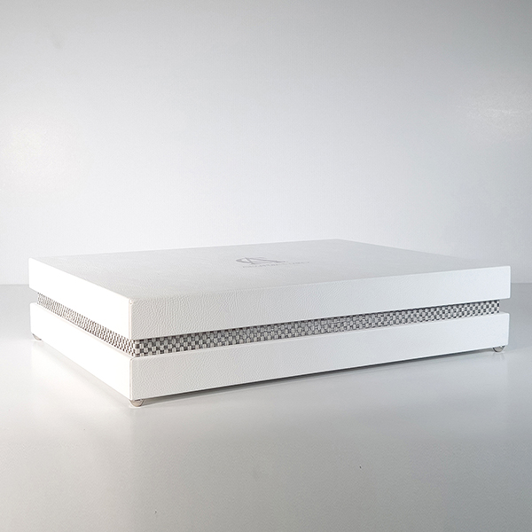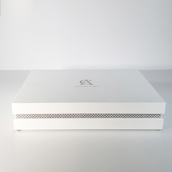 Case in e-leather bianco e alzatine ad incastro in intreccio grigio. Guscio superiore personalizzato con iniziali in stampa UV in rilievo. Interni superiore ed inferiore in stampa UV in rilievo a fantasia diamantata personalizzati con nomi e logo. Struttura impreziosita da nastro in e-leather per facilitare la presa dell’album e piedini da rialzo in metallo argento.
