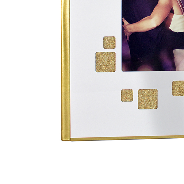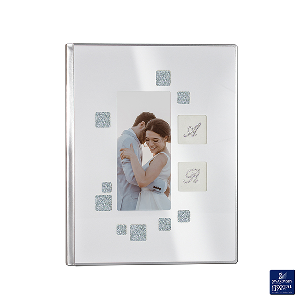Album in vernice argento con copertina in plexiglass bianco e photo. Riquadri in glitter argento e velluto bianco con iniziali personalizzate da applicazioni di Swarovski.
