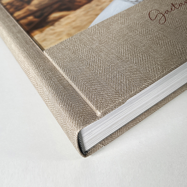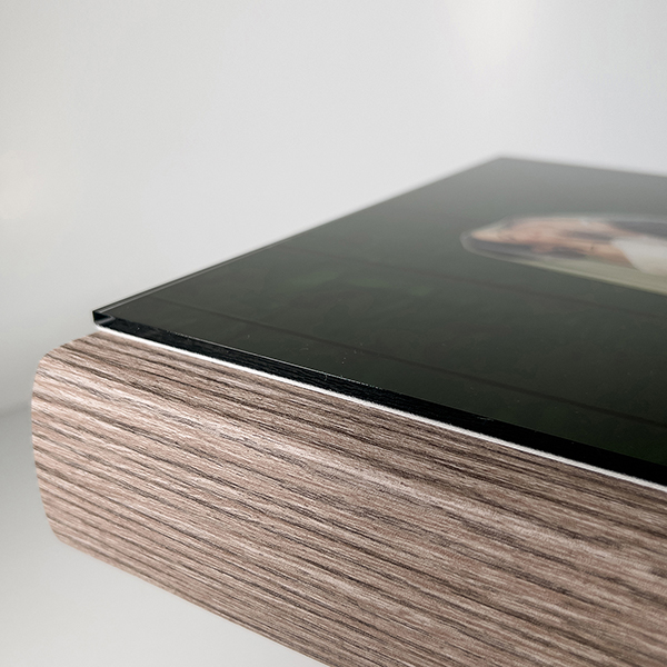 Album in texture zebrano tortora e copertina in plexiglass con photo personalizzabile con nomi in stampa UV in rilievo.