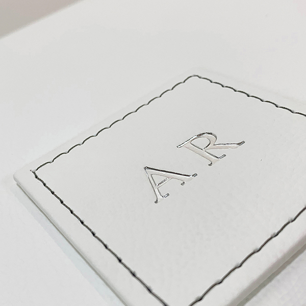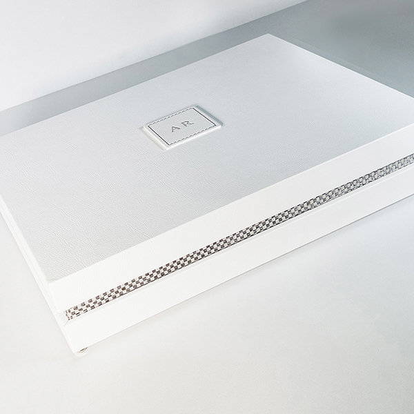 Case in e-leather bianco e alzatine ad incastro in intreccio grigio. Guscio superiore personalizzato con iniziali stampate a caldo in foglia argento su riquadro cucito in e-leather bianco. Interni superiore ed inferiore in stampa UV in rilievo a fantasia diamantata personalizzati con nomi e logo. Struttura impreziosita da nastro in e-leather per facilitare la presa dell’album e piedini da rialzo in metallo argento.